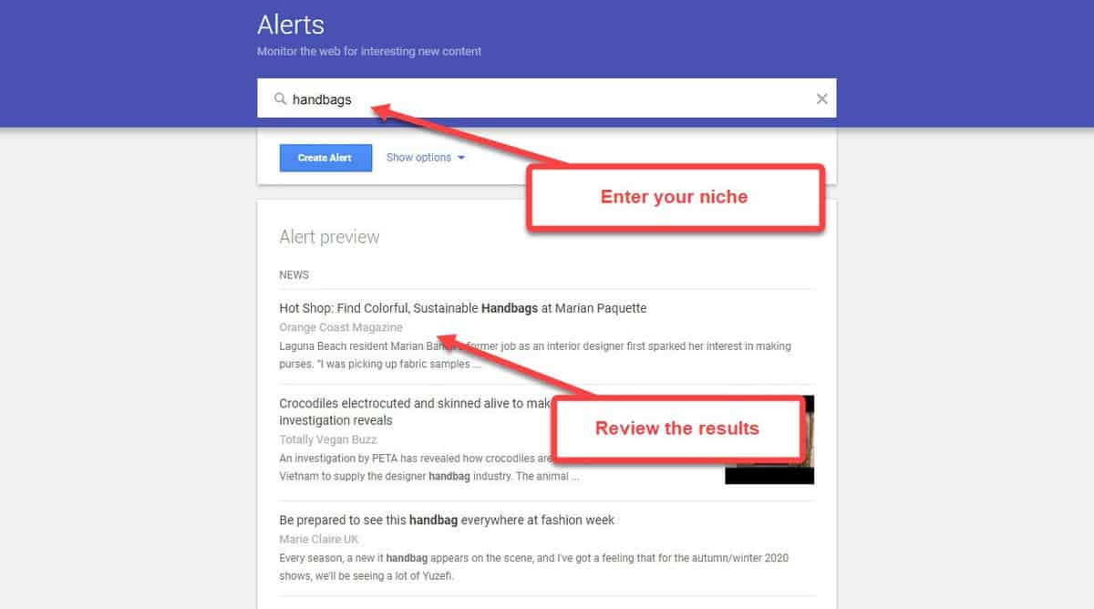 Google Alerts is a feature that notifies you whenever a topic or niche you submitted is being discussed online.