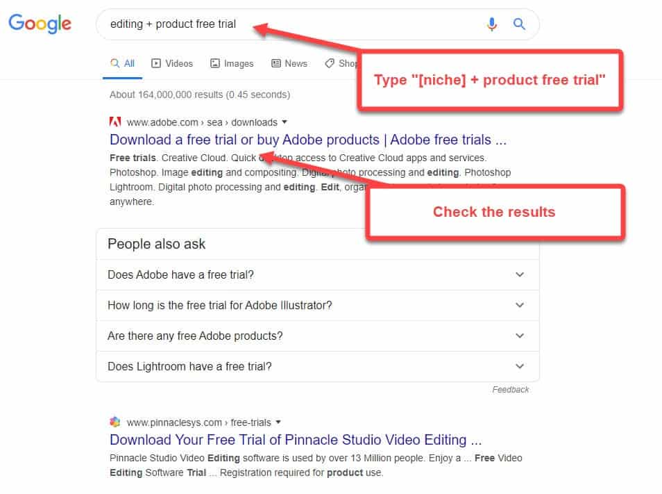 Go to Google and find products that offer free trials. Use the search phrase “[niche] + product free trial” as your query.
