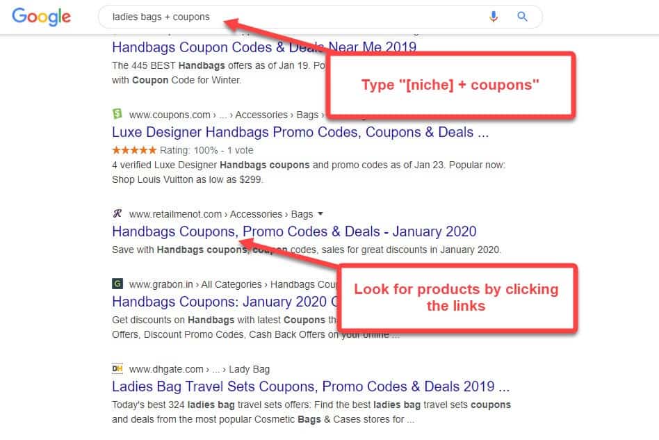 There’s no shortage of product options on Google’s database. All you need to find them are the right keywords like “[niche] + discount” or “[niche] + coupons”