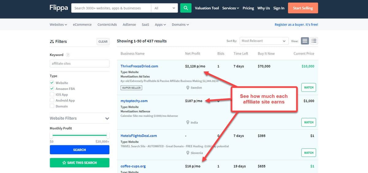 17. Check Out Affiliate Sites That Got Sold on Flippa