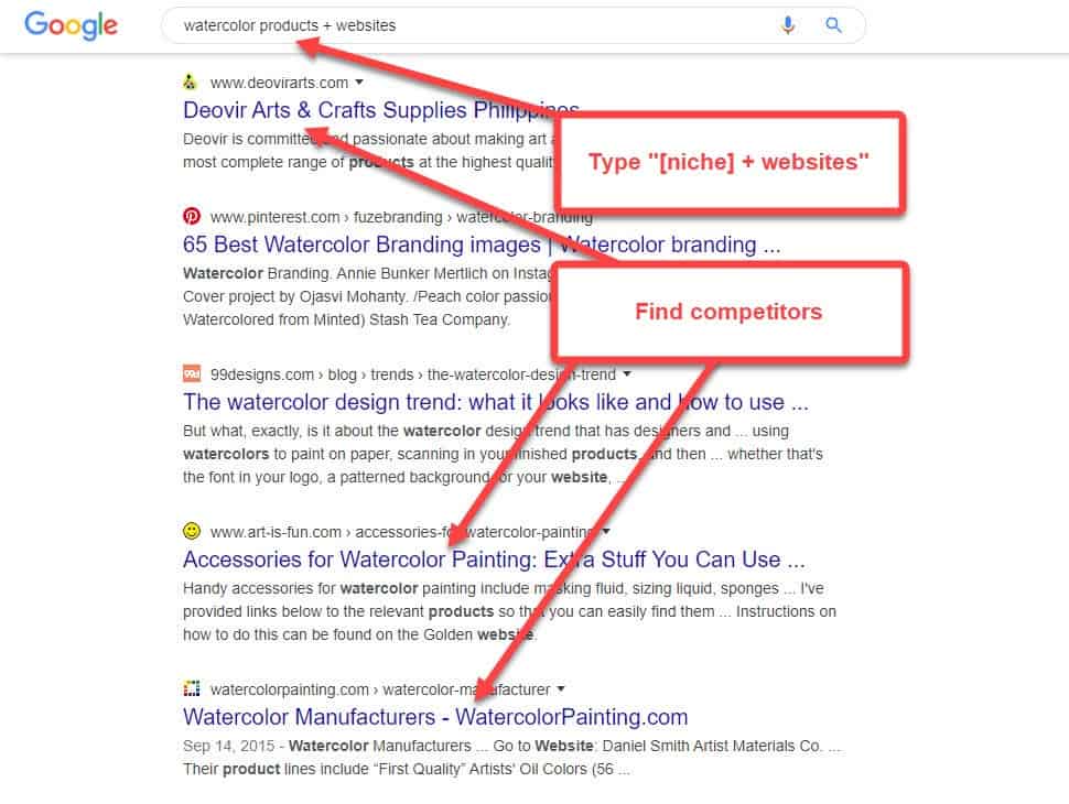 With the help of Google, you can find affiliate sites that are working in the same niche as you. Look for them using “[niche] + websites” as your search term.