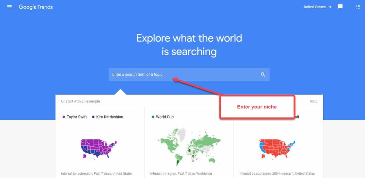 Enter a keyword (or a niche) in the search bar. Once you hit Search, you’ll be shown a graph that indicates how popular the term is over a given period.