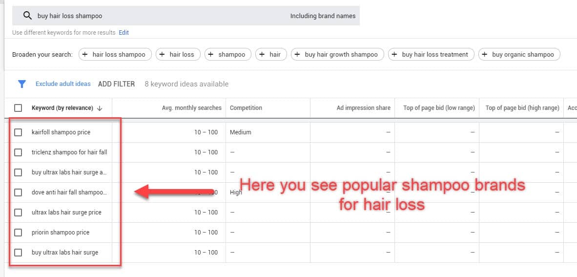 By using transactional keywords (like “buy hair loss shampoo”), you’d find keywords that include brand names. You’re able to see what products people are searching for within a given niche.