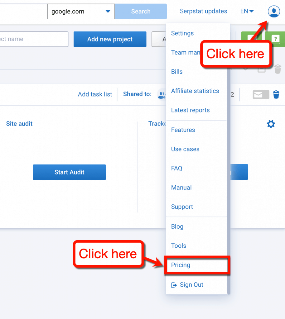 6. On your dashboard, click on your profile photo and select ‘Pricing‘ from the main menu.