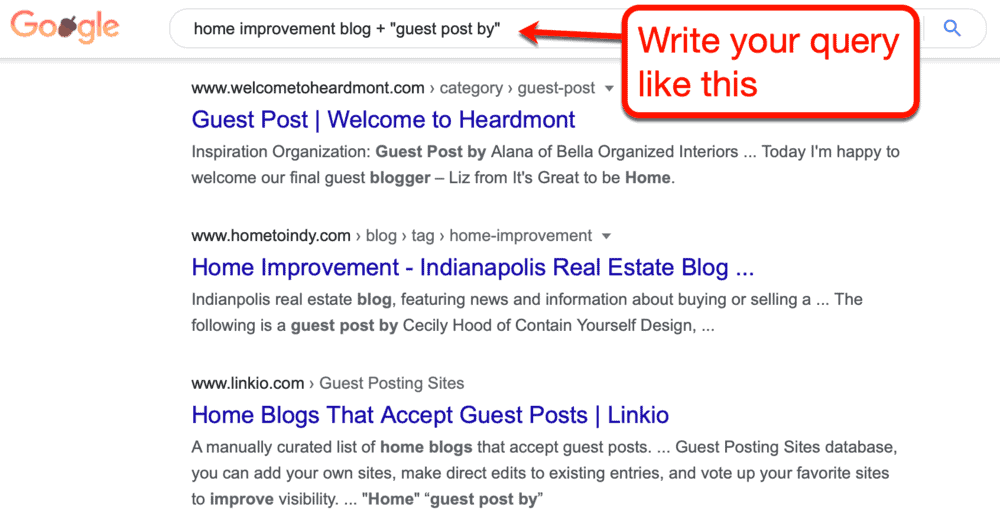 For example, if you’re in the home improvement niche, use a keyword like “home improvement blog” along with a footprint.