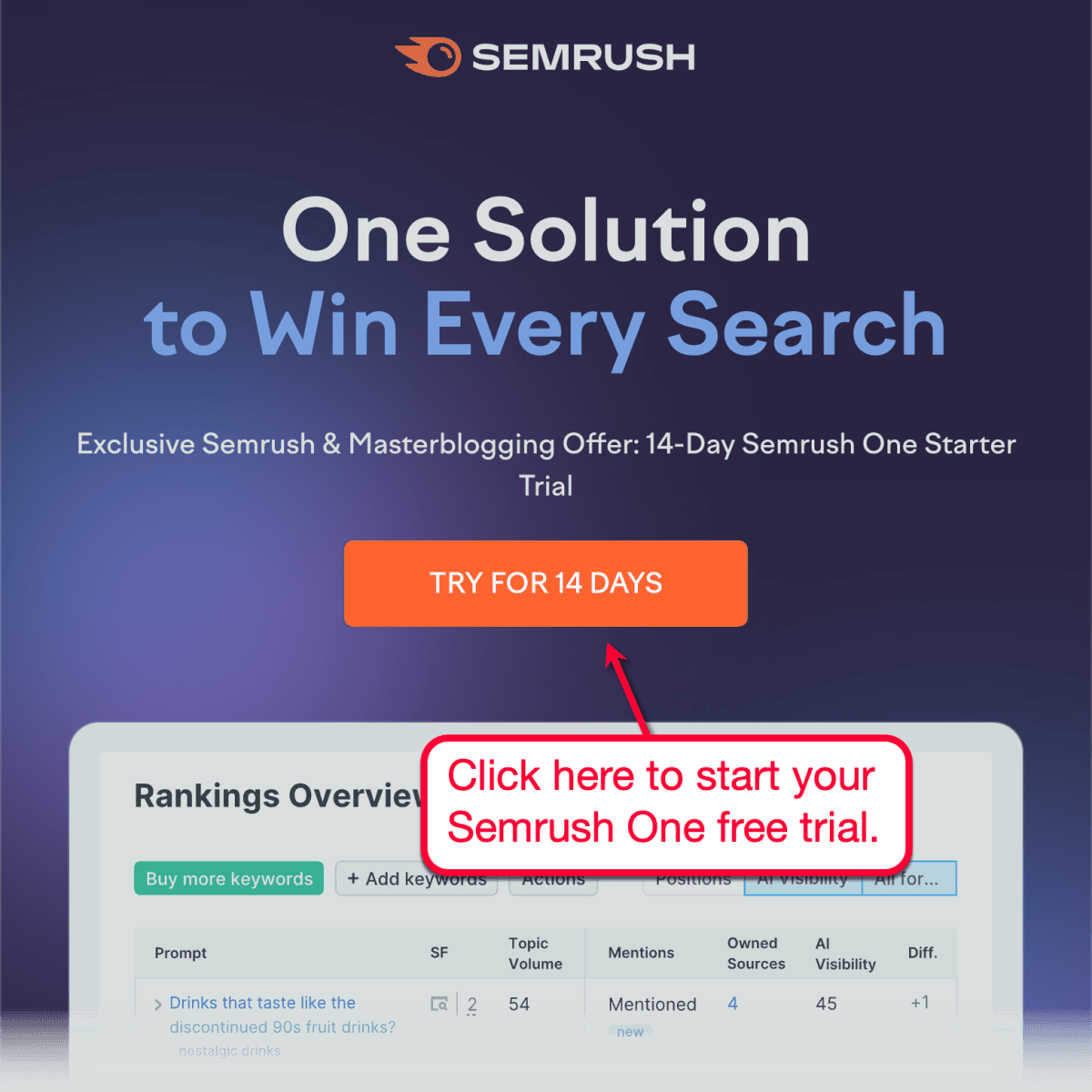 Again, this exclusive free trial unlocks all Semrush One features — no limitations, no drawbacks. Make the most out of your trial by reading our full SEO + AEO guide here.