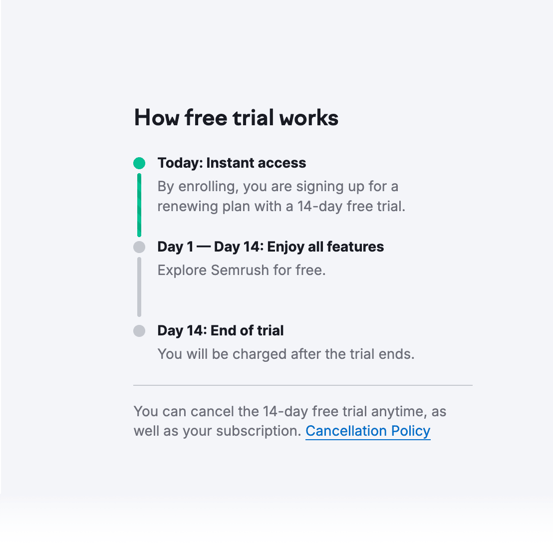 You’ll have full access to all keyword research, site analysis, and rank tracking features during your trial. Just remember that starting your trial requires a valid payment method, which will be charged automatically once the trial expires.