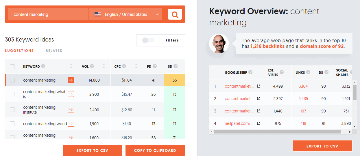 On the left, you will see a list of keyword suggestions for the seed keyword “content marketing.”