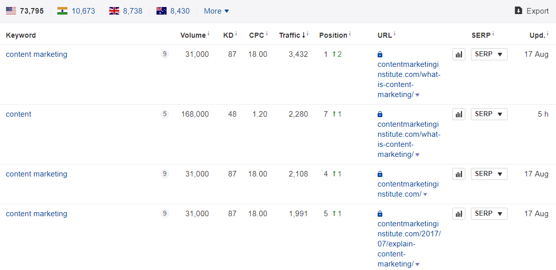 In the screenshot above, I’m using Ahrefs to find keywords that contentmarketinginstitute.com is ranking for.