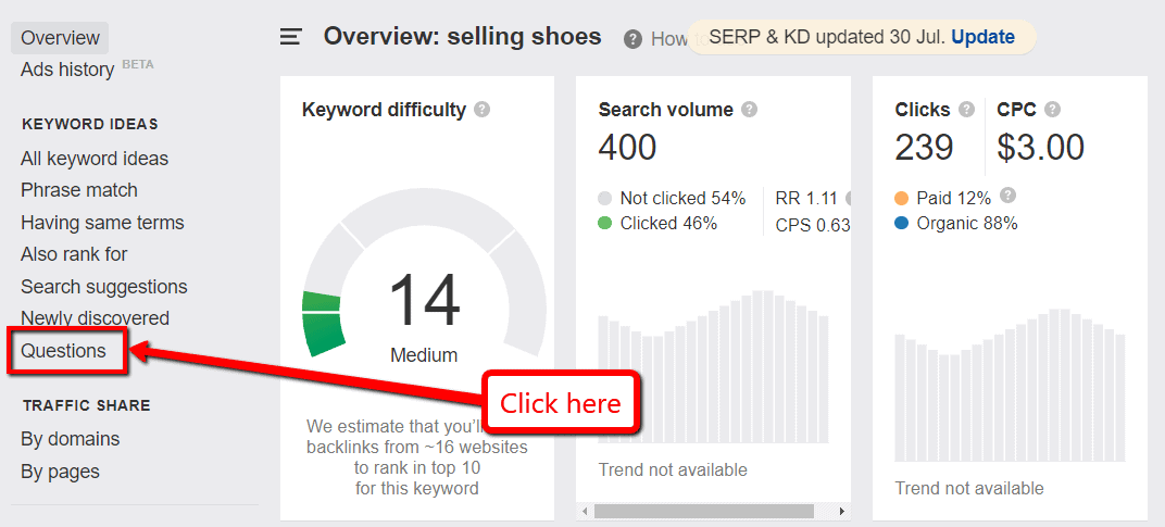 To find this using Ahrefs, type in the keyword in the search bar of Keyword Explorer.