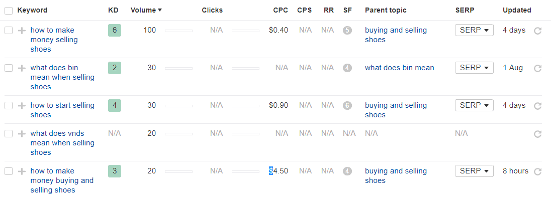 From here, you will see a list of keywords related to selling shoes that begin with any of the 5 Ws and 1 H.
