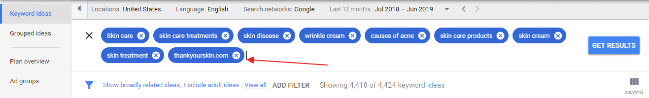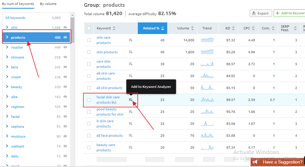 Then, if you notice any keyword you like from the suggested list, you can just click on the little (+ sign) to add it among the keywords you’ll properly analyze later. From the image above, you can see the pointer on the keyword “facial skin care products list.”