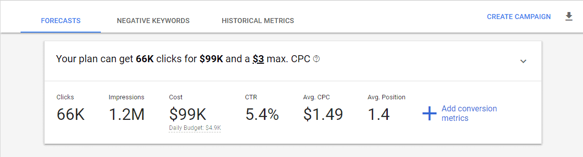 Click on the “Historical Metrics” tab, and Google will show you 12-month average search volumes for the keywords you entered: