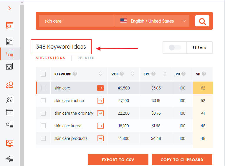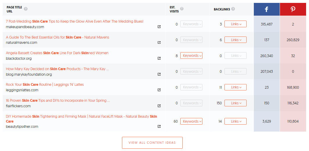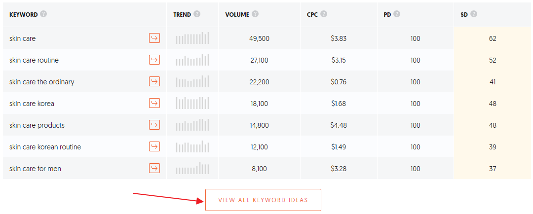 The second part of the Ubersuggest keyword research process is the ideas section. Using our “skin care” keyword as an example again, click on the “View all Keyword Ideas” button to view all the keyword suggestions for your target keyword: