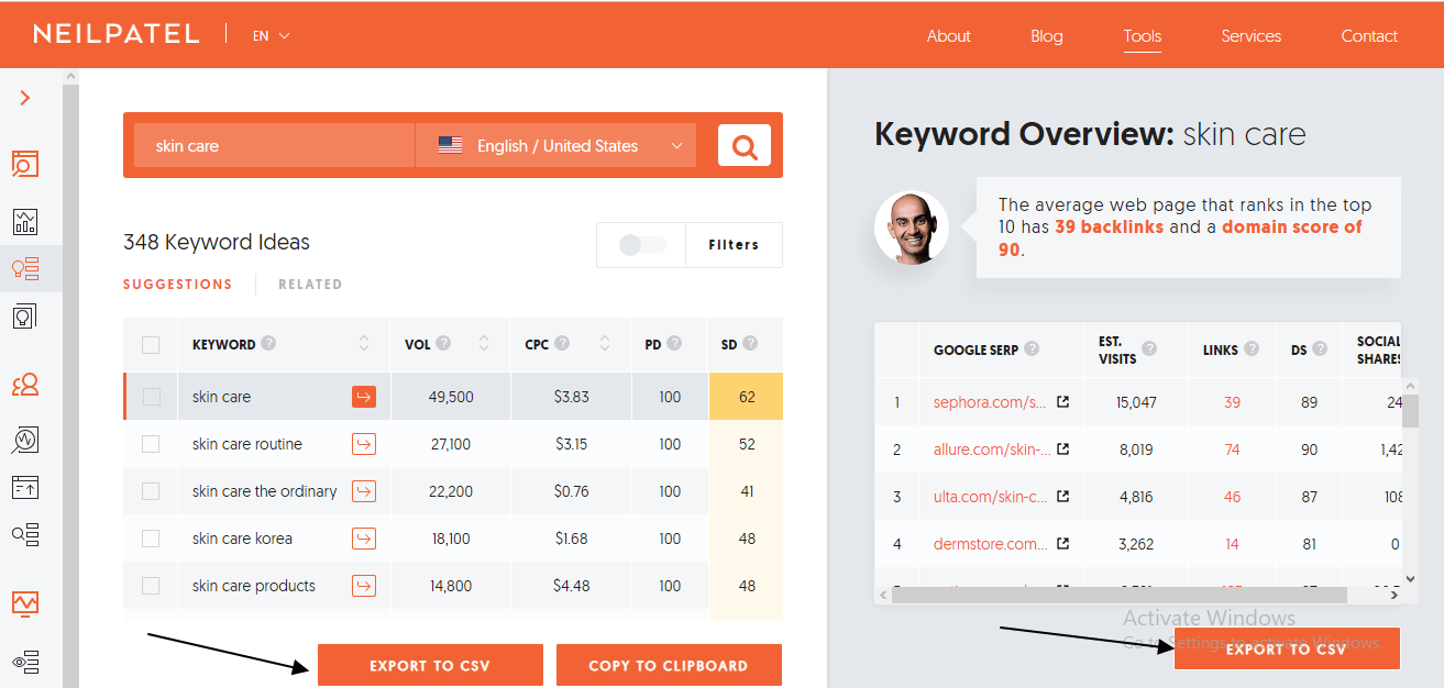 Ubersuggest also gives you the ability to Export your results to in CSV format: