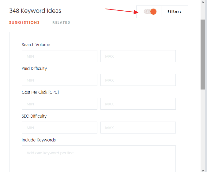 Here, you can easily filter the keywords based on your preferred data point. From limiting the results to just “keyword suggestions or “related keywords” or by filtering keywords based on their competition and popularity.