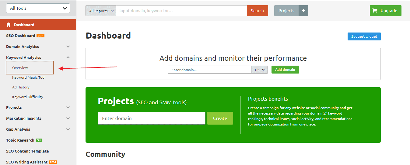 Visit the SEMrush dashboard, and click on the “Overview” tab (on the left-hand sidebar) under keyword analytics options: