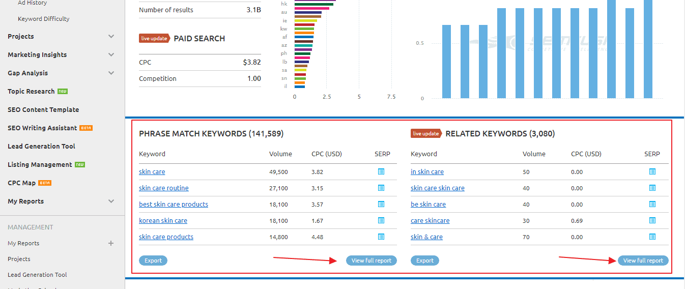 In the screenshot above, we have four different reports for our chosen parent keyword “skin care.” Let’s quickly look at that: