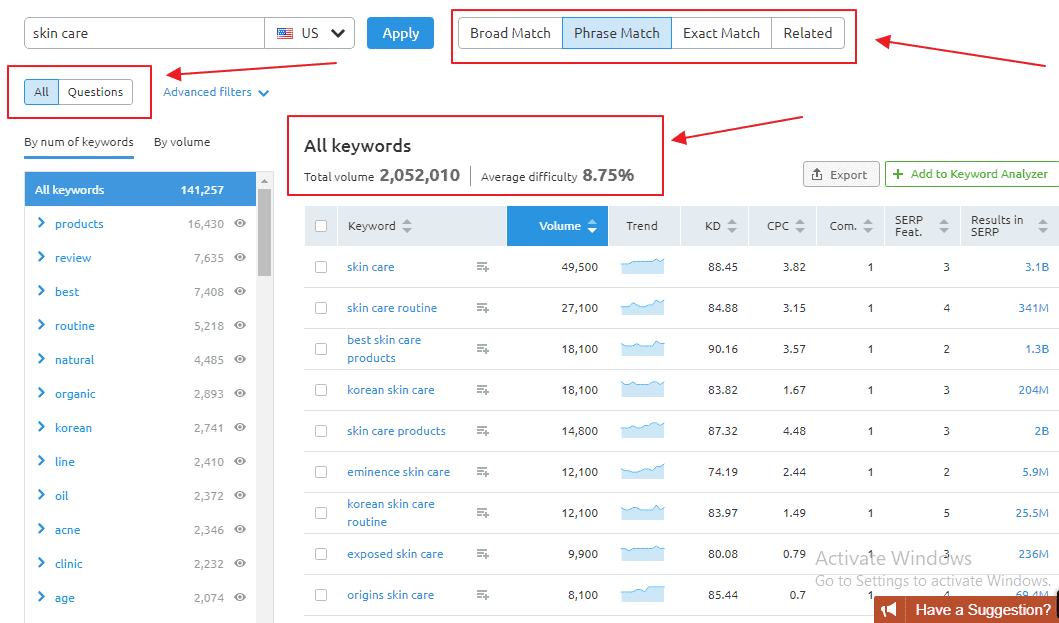 With the “phrase match” feature, you’ll be able to find every possible keyword that is closely related to your parent keywords together with alternative words.