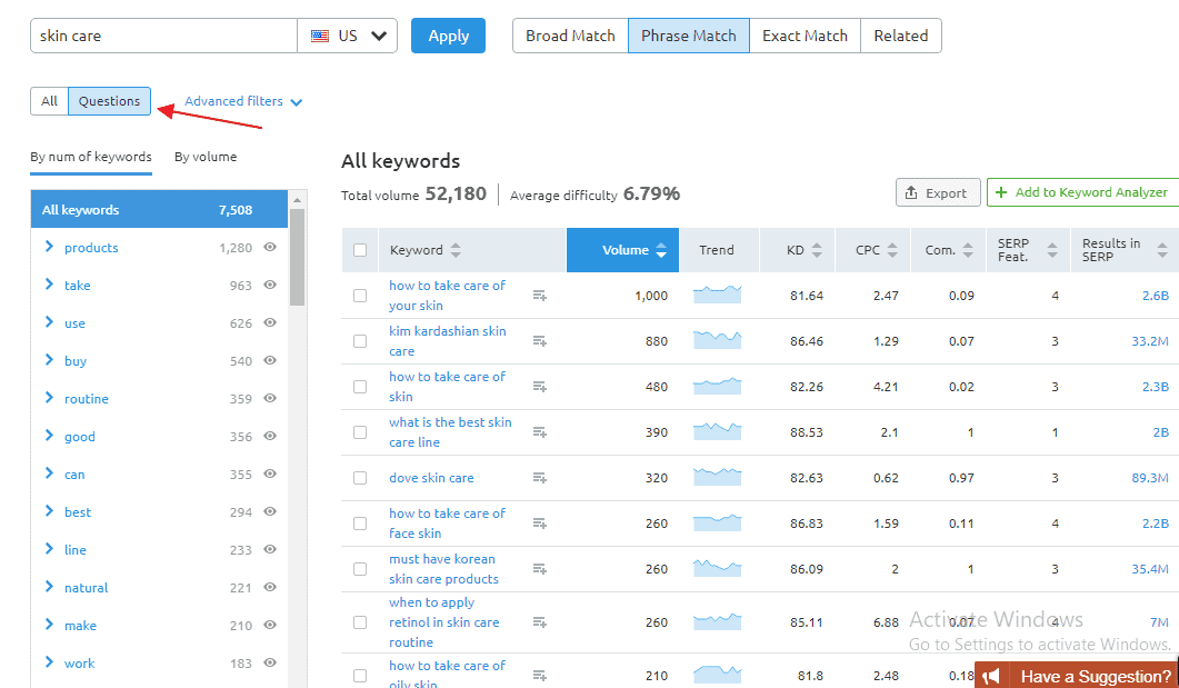 You also have the option to either see all the keyword suggestions or to see only the “question related” keywords:
